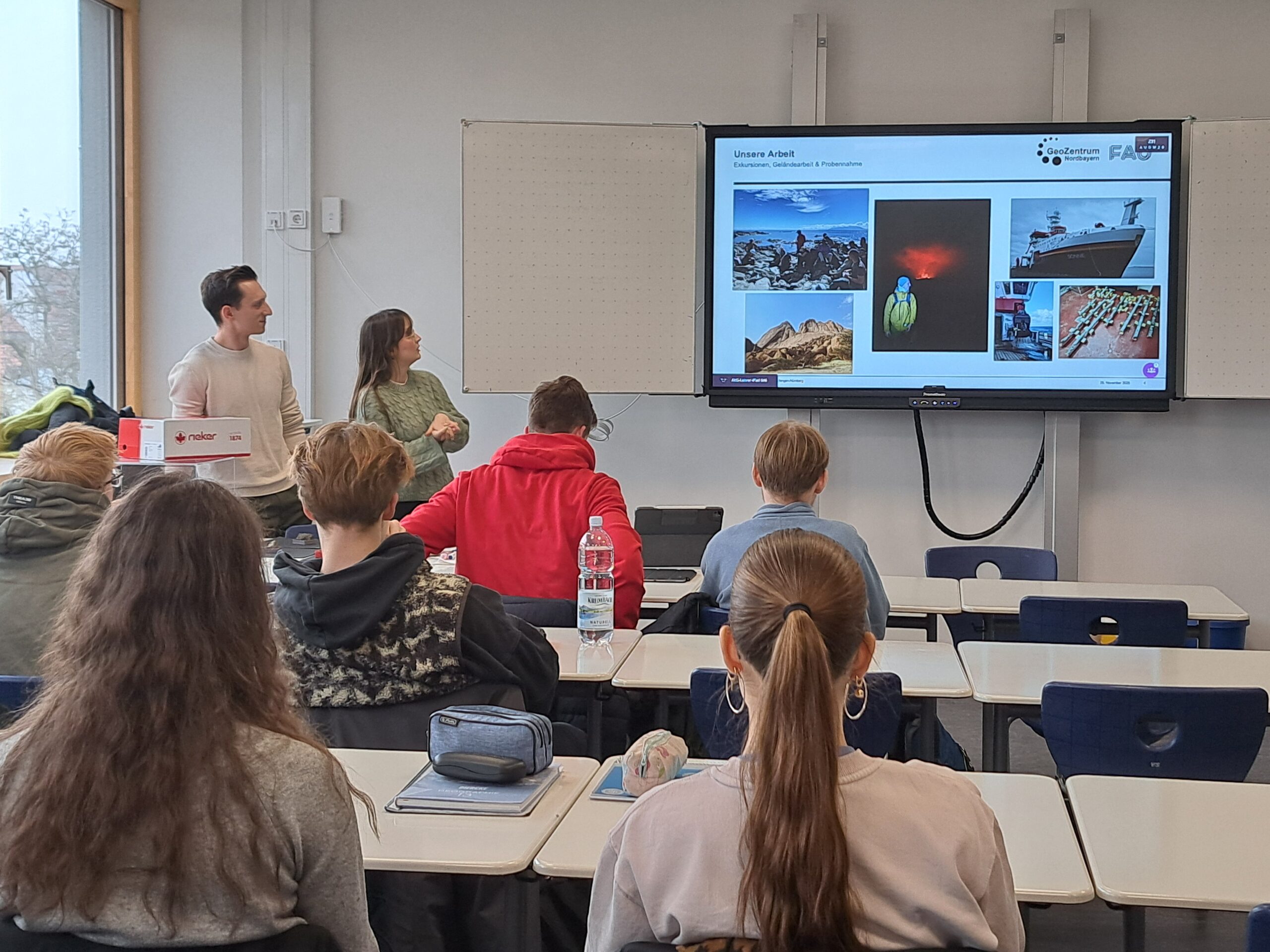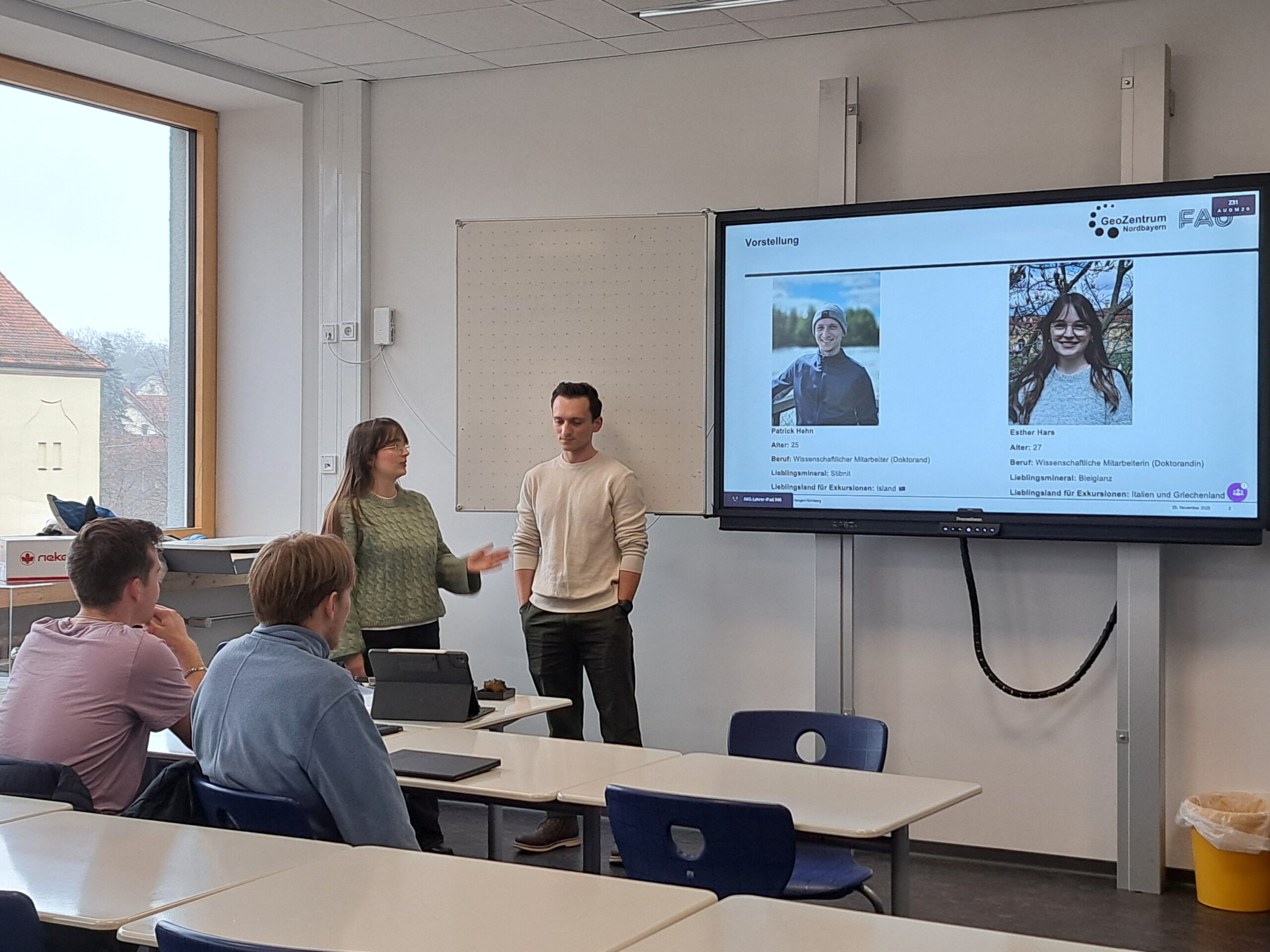 Im Rahmen der Bildungs- und Nachwuchsarbeit besuchten M.Sc. Patrick Hehn und M.Sc. Esther Harß, Doktorand:innen der Arbeitsgruppe Endogene Geodynamik (GeoZentrum Nordbayern, FAU), am 25.11.2025 und am 09.12.2025 jeweils eine 13. Klasse des Adam-Kraft-Gymnasiums in Schwabach.