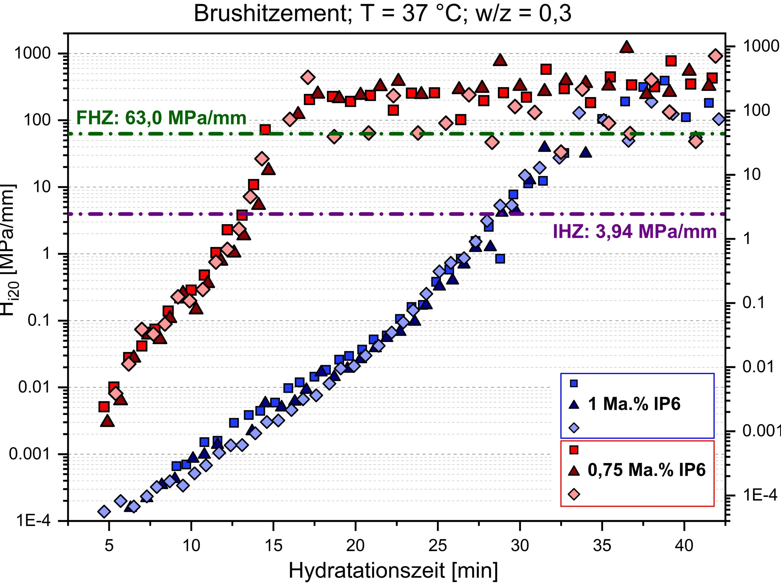 Bei dem Testverfahren wird eine Probe in Richtung einer zylinderförmigen Nadel angehoben. Die IMETER-Härte Hi20 wird zu definierten Zeitpunkten während des Hydratationsprozesses ermittelt und somit Änderungen in der Konsistenz des Materials kontinuierlich detektiert. Jeder Messpunkt wird dabei an einer ungestörten Materialoberfläche gewonnen.