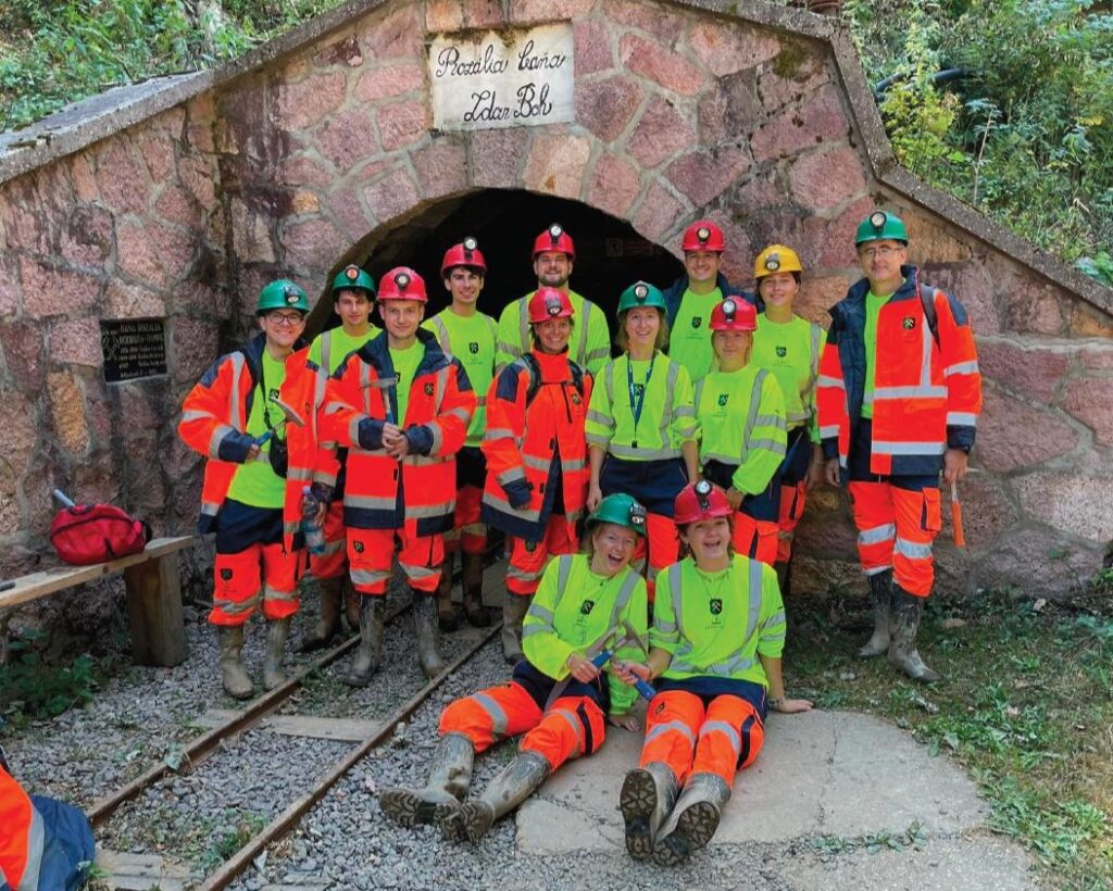Our chapter’s inaugural field trip was an excursion to the Kropfmühl graphite mine in the southern Bohemian Massif. Thirteen eager students embarked on an immersive journey, exploring the underground workings and production shafts that have been operational since 1870. The fascinating, highly-metamorphic paragenesis comprised dark, graphite-bearing garnet- gneisses, luminous quartzitic gneisses, quartzitic insertions, amphibolite layers, calc-silicate marbles (skarns), and calcsilicate formations. For many it was the first time to go underground and a very memorable experience to see the rock formations at depth. Back on the surface, the students were able to see how the graphite is prepared and processed to be eventually turned into graphite products such as expandable graphite or dispersions for metallurgy. Overall, it was a very exciting first field trip of our SGA student chapter!